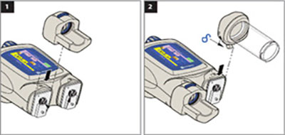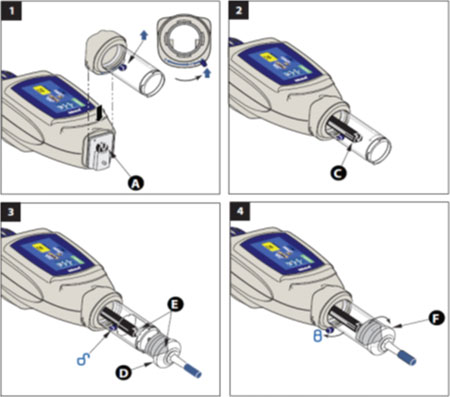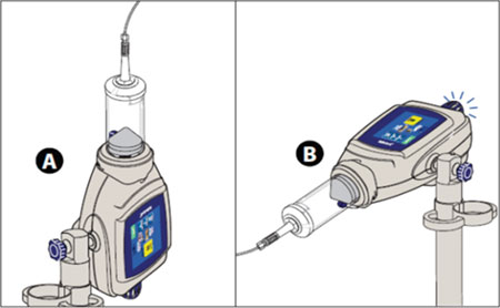 모든 공기가 제거되고 튜빙에 프라임 된 후 파워 헤드는 누수를 방지하기 위해 주입이 준비될 때 까지 반드시 수직 방향으로 위치되어야 한다.(Ⓐ)