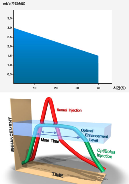 조영제가 환자에게 주입되는 동안 설정된 주입속도를 프로그램에 의해서 점차적으로 늦춰 주는 기능